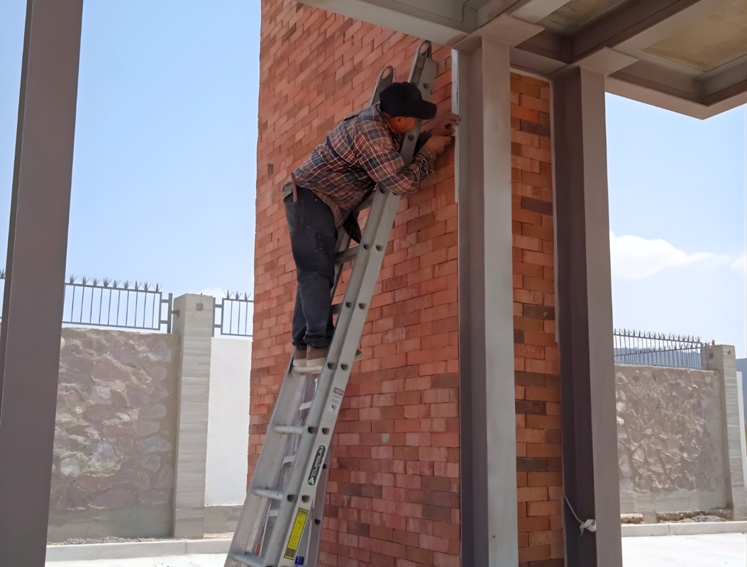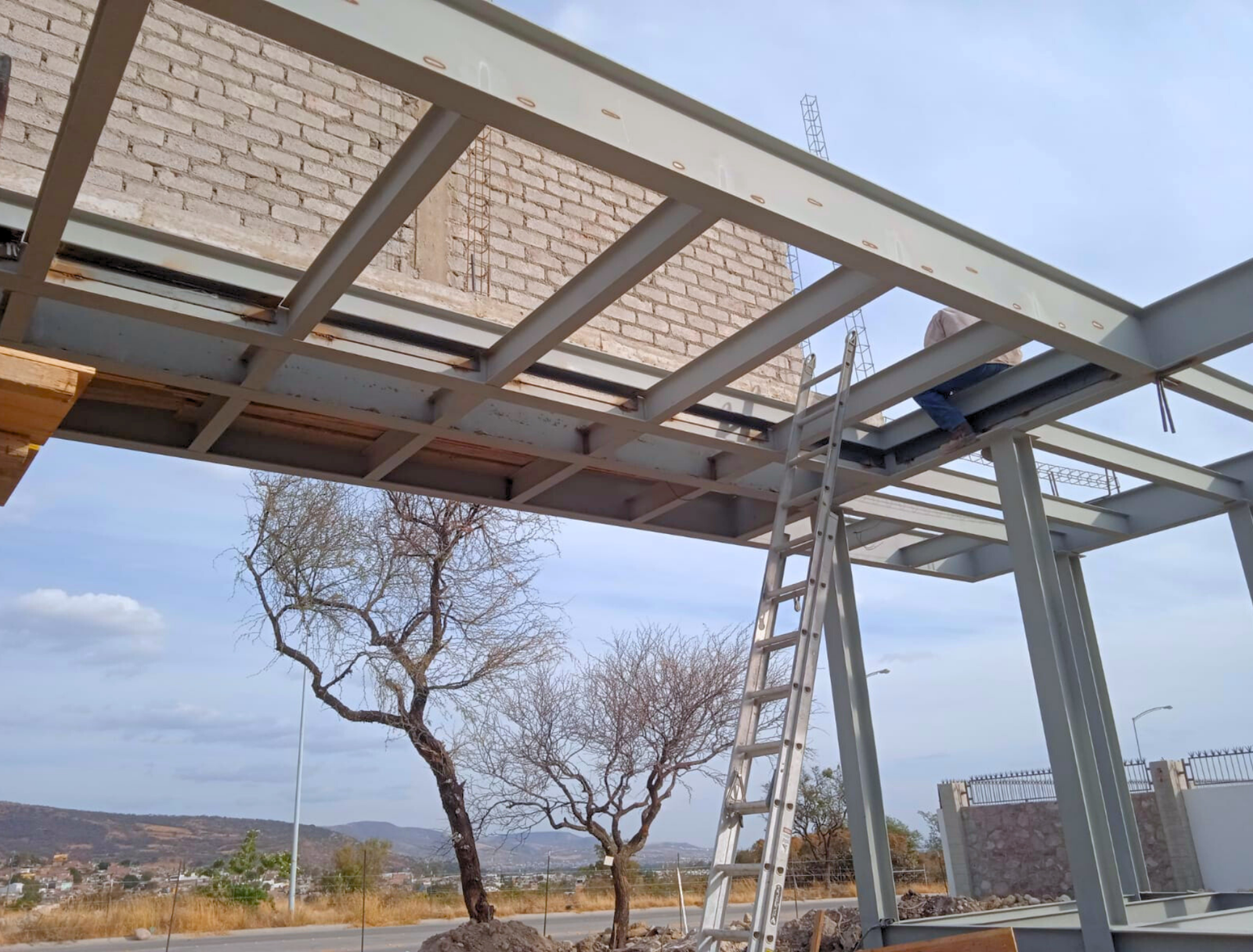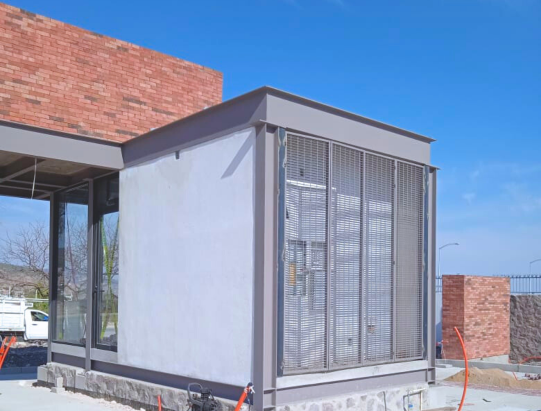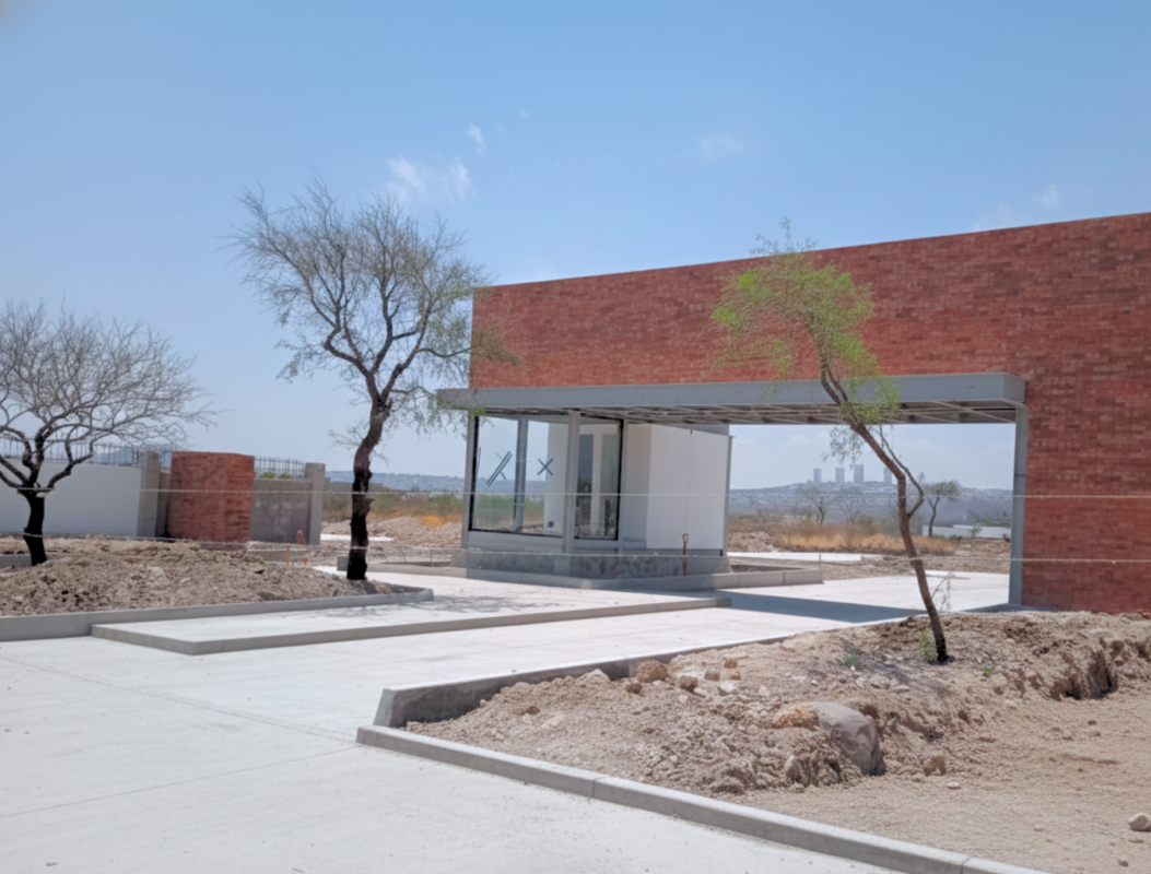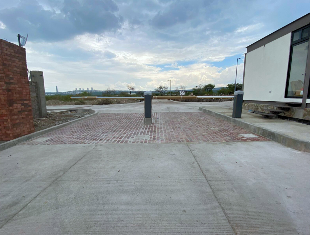 Es una cimentación aislada con una estructura de acero, lozas y firmes de concreto, este acceso es una caseta con un baño, cuenta con una loza o cubierta donde se paran los carros para que puedan registrarse además construimos un muro que abraza por la parte de un lado y arriba de esta estructura principal se forro con fachada y todas las instalaciones especiales por ejemplo relleno sanitario se instaló una cisterna ahogada en la banqueta, la parte eléctrica, parte de sistemas, la aplicación que controla las plumas, también ciertos aspectos de la vialidades, trasplantamos varios árboles, los detalles finales como acabados de madera también los ejecutamos nosotros, el totem donde señala el nombre de LOMAS V la estructura metálica donde hicimos una cimentación muy sencilla, además de cancelerías, puertas, todo lo que es requerido.