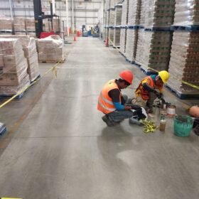 El DHL se realizó un levantamiento topográfico para la reparación del firme de concreto existente, el cual, por temas de uso y operación se se dañó, se agrietó este levantamiento topográfico no sirvió para darle la planicie adecuada al firme, ya que por temas de maniobras afectaba la operación de la empresa, se desvastó y se resanó para lograr esta parte lisa en toda el área de esta nave de DHL.