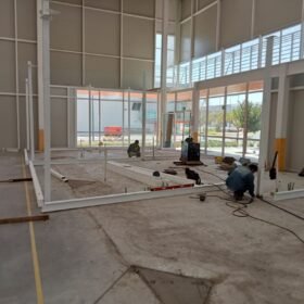 Para el cliente Sews desarrollamos oficinas dentro de una nave industrial existente. El proyecto incluyó la construcción de un firme de concreto con estructura metálica, dividiendo el espacio en área de oficinas y baños independientes.